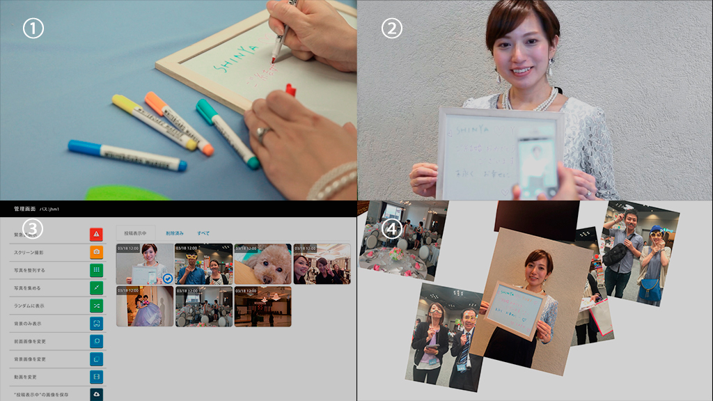 投稿写真を1枚選んでボタンを押せば、その写真が改めてスクリーンへ!複数写真を選択してボタンを押せば、その中のどれかの写真がランダムに表示されます!デジタルチェキとして使用して、」ビンゴ、ベストドレッサー、ベストショット、景品当選者選びなどのゲーム機能がフォトシャワーでアレンジできます!